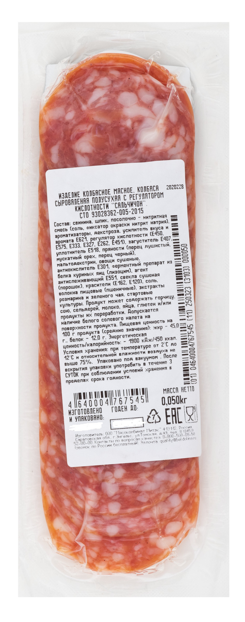 Свинина, шпик, посолочно - нитритная смесь соль, фиксатор окраски нитрит натрия, ароматизаторы, декстроза, усилитель вкуса и аромата Е621, регулятор кислотности Е450, Е575, Е333, Е327, Е262, Е451, загуститель Е407, уплотнитель Е518, пряности перец душистый, мускатный орех, перец чёрный, мальтодекстрин, овощи сушёные, антиокислитель Е301, ферментный препарат из белка куриных яиц лизоцим, агент антислеживающий Е551, свёкла сушёная порошок, красители Е162, Е120, соль, волокна пищевые пшеничные, экстракты розмарина и зелёного чая, стартовые культуры.
