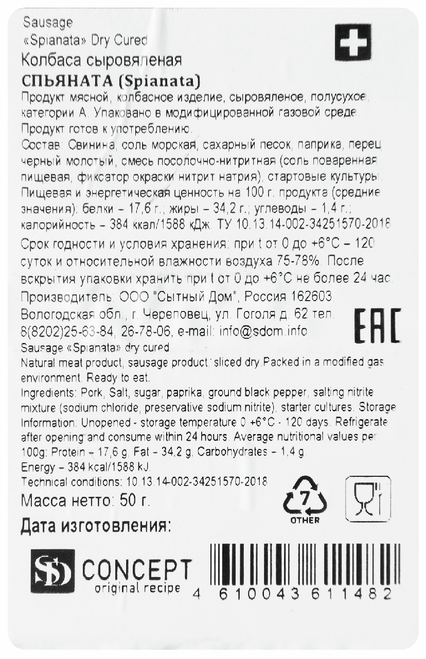 Колбаса SD Spianata сыровяленая нарезка, 50г