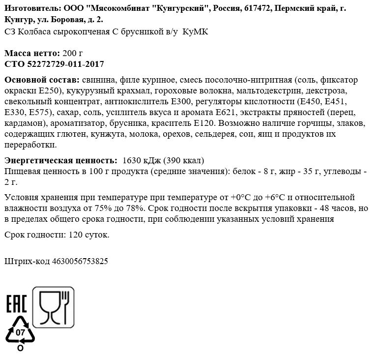 Свинина, филе куриное, смесь посолочно-нитритная, сахар, соль, экстракты пряностей (перец черный, кардамон), брусника, подсолнечное масло.