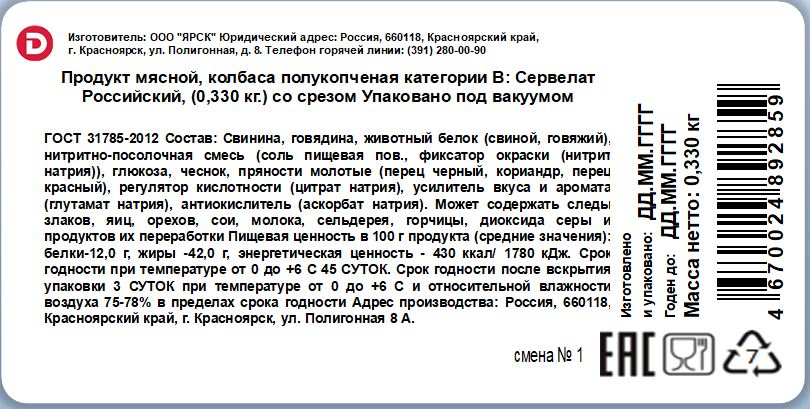 Свинина, говядина, животный белок свиной, говяжий, нитритно-посолочная смесь соль пищевая поваренная, фиксатор окраски нитрит натрия, глюкоза, чеснок, пряности молотые перец черный, кориандр, перец красный, регулятор кислотности цитрат натрия, усилитель вкуса и аромата глутамат натрия, антиокислитель аскорбат натрия. Может содержать следы злаков, яиц, орехов, сои, молока, сельдерея, горчицы, диоксида серы и продуктов их переработки.