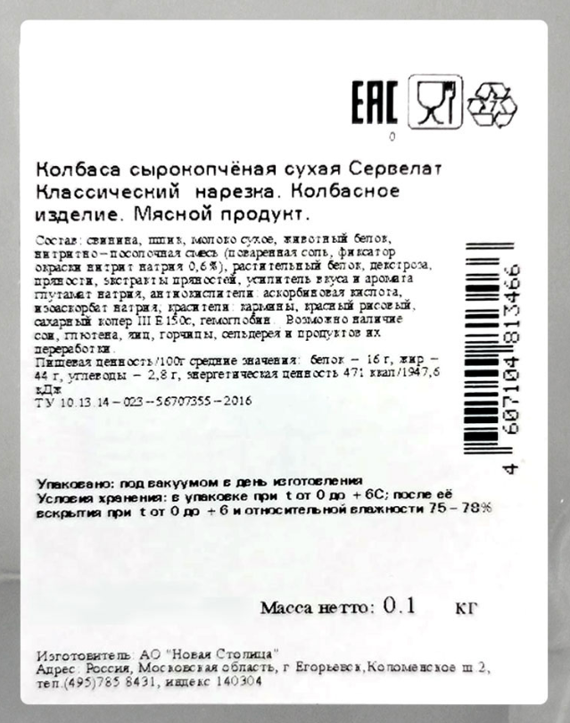 Колбаса сервелат Егорьевская фабрика классический нарезка, 100г