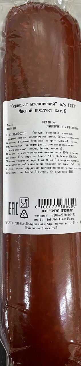 Колбаса сервелат московский деликатесная полукопченая, ~650г