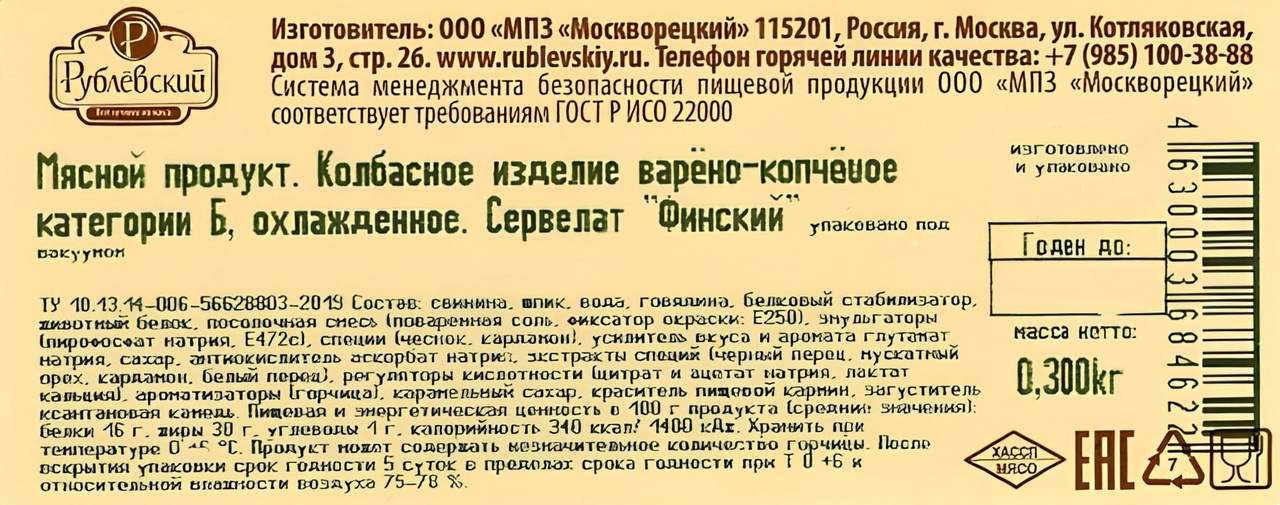 Колбаса сервелат Рублевский финский варено-копченая, 300г