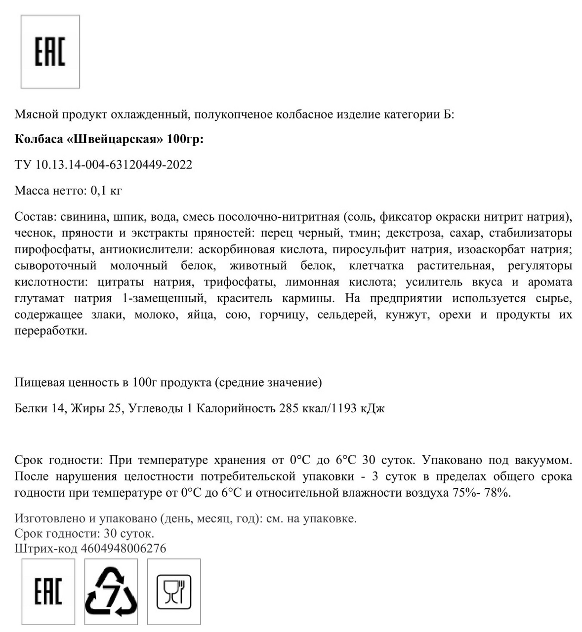 Свинина, шпик, вода, смесь посолочно-нитритная (соль, фиксатор окраски нитрит натрия), чеснок, пряности и экстракты пряностей: перец черный, тмин, декстроза, сахар, стабилизаторы пирофосфаты, антиокислители: аскорбиновая кислота, пиросульфит натрия, изоаскорбат натрия, сывороточный молочный белок, животный белок, клетчатка растительная, регуляторы кислотности: цитраты натрия, трифосфаты, лимонная кислота, усилитель вкуса и аромата глутамат натрия 1-замещенный, краситель кармины.