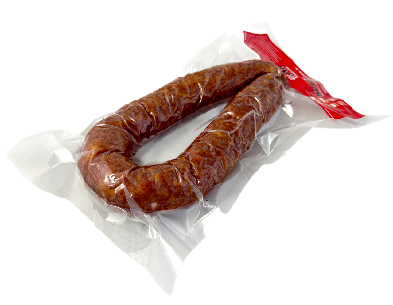 Это мясной деликатес из отборной свинины, говядины и сочной свиной грудинки с добавлением ароматного чеснока. Колбаса имеет крупнокусковую структуру. Копчение на буковой щепе усиливает вкусо-ароматические характеристики продукта. Это отличная основа для сытных бутербродов, а также прекрасный повод разнообразить домашнее меню и приготовить оригинальные испанские закуски тапас с копченой колбасой.