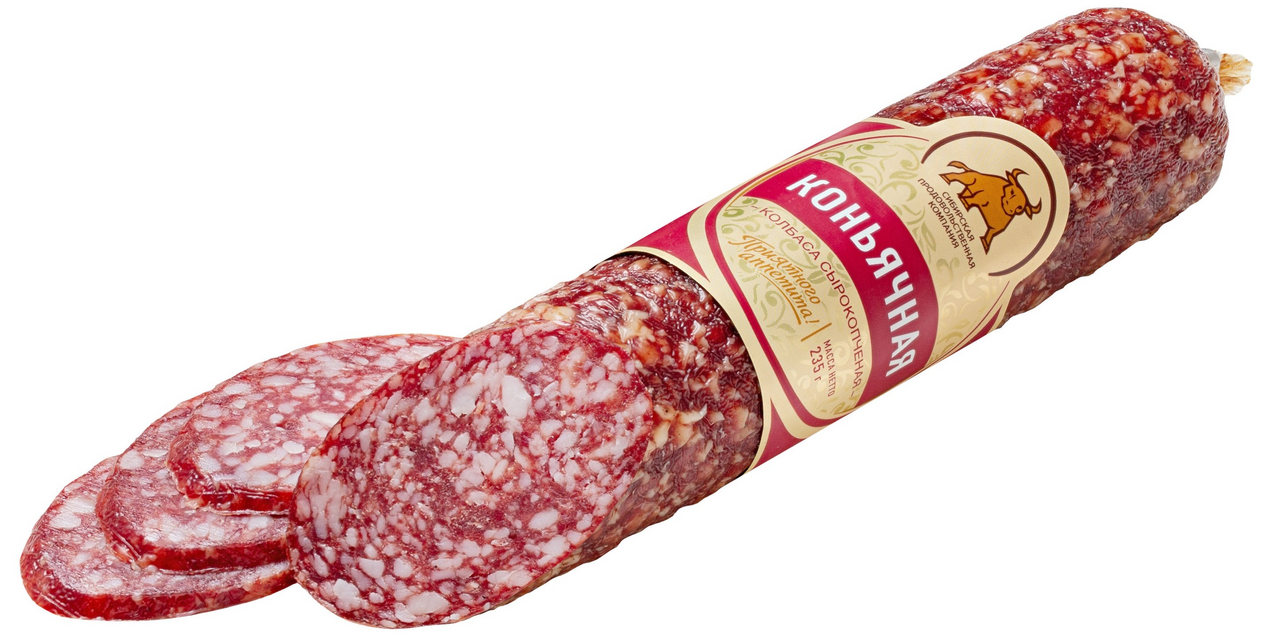 Свинина, шпик, говядина, соевый белок, соль, пшеничная клетчатка, сахар, специи (перец белый, имбирь), коньяк, усилитель вкуса и аромата (глутамат натрия), ароматизаторы, декстроза, антиокислитель (аскорбат натрия), краситель (кармин), мальтодекстрин, стартовые культуры, фиксатор окраски (нитрит натрия).