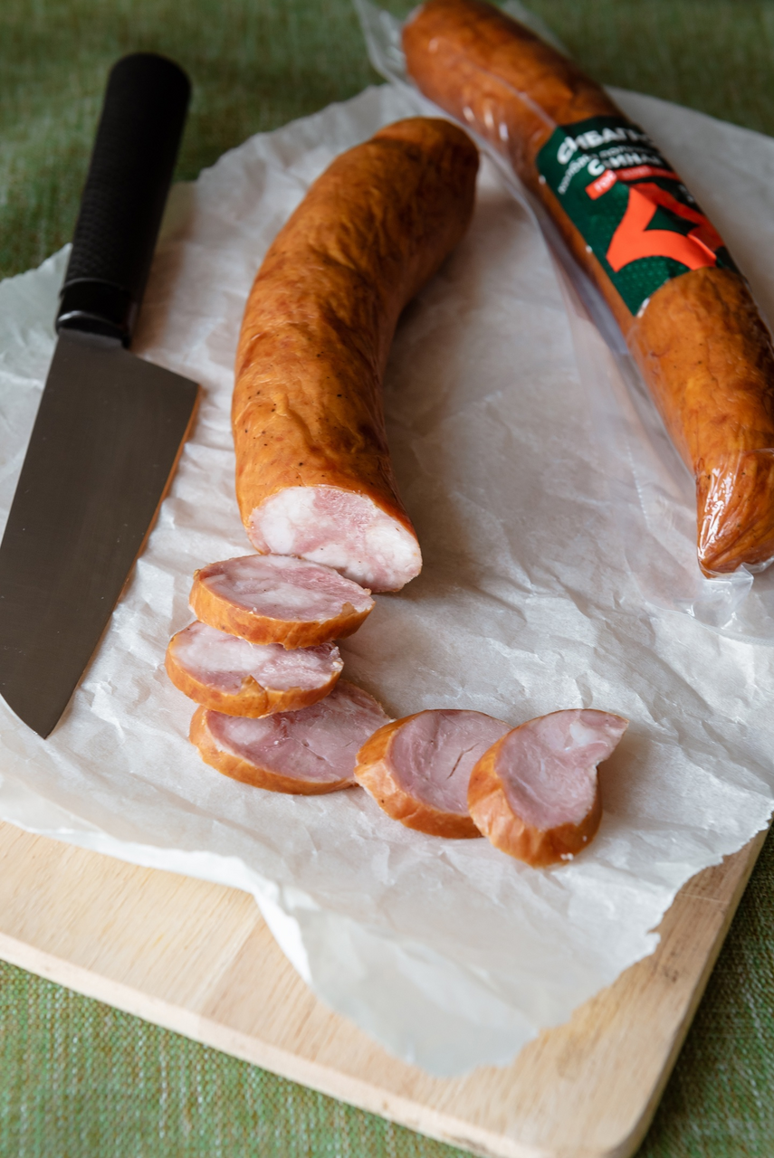 Полукопченый натуральный мясной продукт. В состав входит ароматная свинина. В производстве применяются только натуральные специи: чеснок, перец черный, мускатный орех. Продукт имеет нежный, мягкий вкус, а натуральное копчение придает приятный аромат классической копченой колбасы. Универсальный продукт, который как может украсить и любую мясную тарелку, так и стать отличным дополнением к салату или вкуснейшему горячему бутерброду.