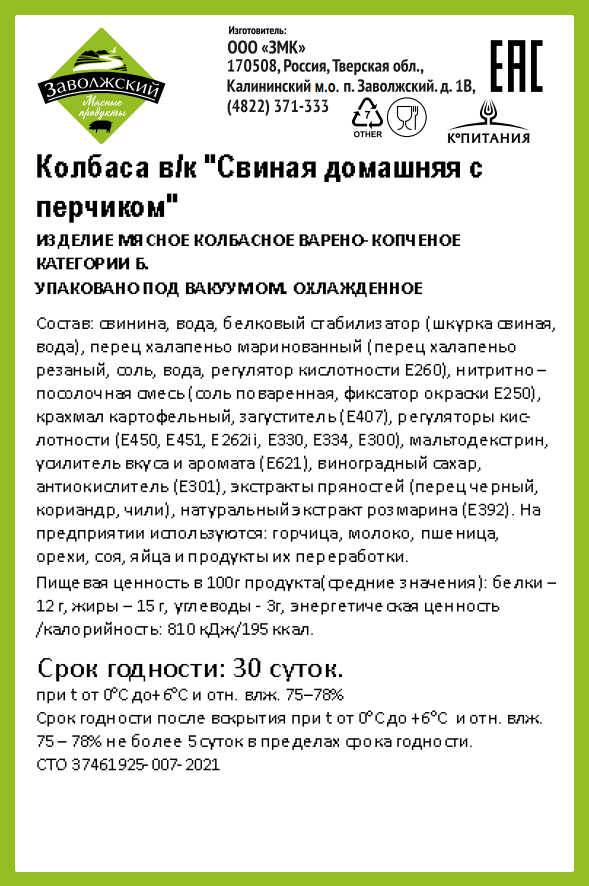 Свинина, вода, перец халапеньо маринованный, нитритно-посолочная смесь (соль поваренная, фиксатор окраски - нитрит натрия), крахмал картофельный, загуститель (Е407), регуляторы кислотности (Е450, Е451, E262ii, Е330, Е334, E300), мальтодекстрин, усилитель вкуса и аромата (Е621), виноградный сахар, антиокислитель (Е301), экстракты пряностей (перец черный, кориандр, чили), натуральный экстракт розмарина (Е392).