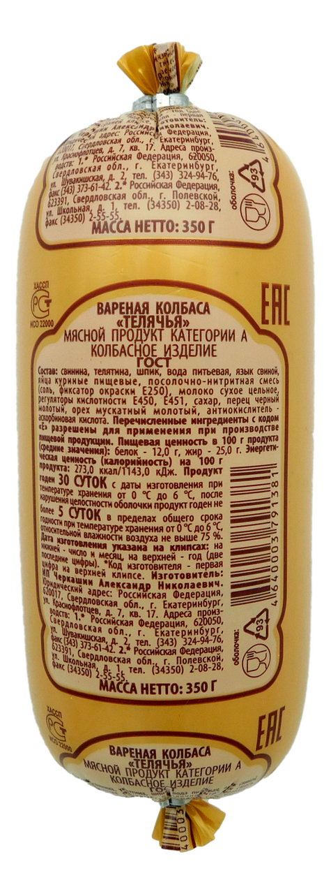 Колбаса телячья Черкашин и Партнеръ вареная ГОСТ, 350г