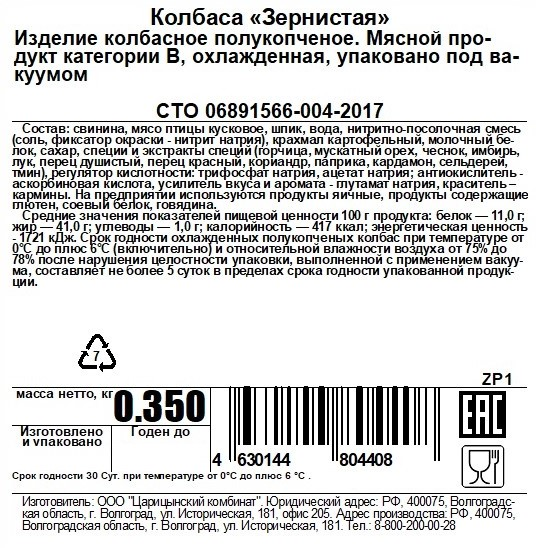 Колбаса Царь-продукт Зернистая полукопченая, 350г