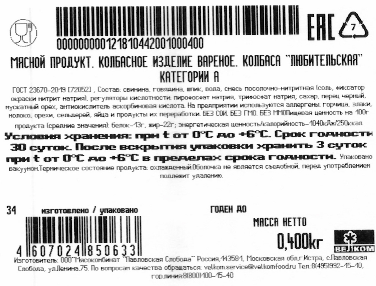 Колбаса Велком Любительская вареная, 400г