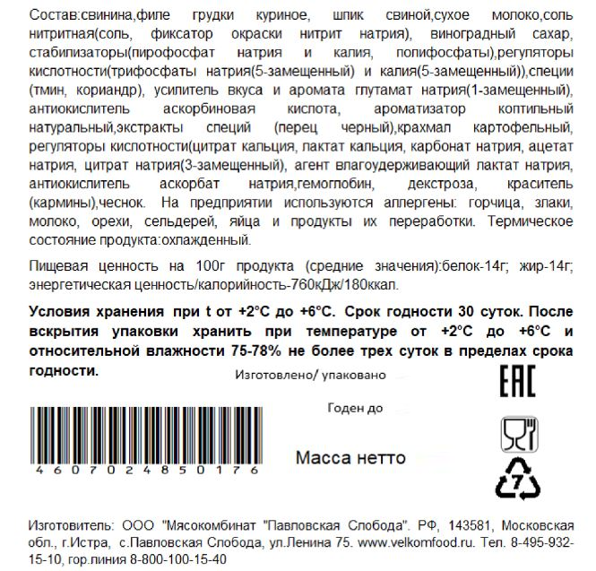 Свинина, шпик, говядина, вода, соль, белок животный, сахар, горчица, паприка, белый перец, мускатный орех, чеснок, имбирь, лук, гвоздика, пажитник, сельдерей, антиокислитель аскорбиновая кислота, краситель натуральный рисовый, фиксатор окраски нитрит натрия.