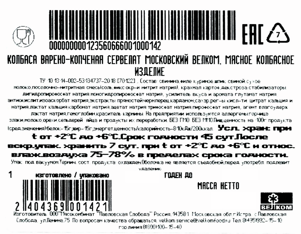 Колбаса Велком сервелат московский варено-копченый, ~580г
