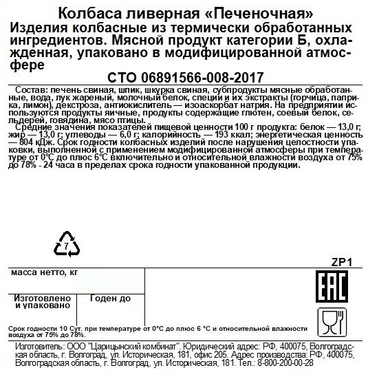 Субпродукты печень свиная, шкура свиная, вымя говяжье, желудок свиной, вода питьевая, лук репчатый свежий, мука пшеничная первый сорт, соль поваренная пищевая, натуральные пряности, комплексная пищевая добавка регуляторы кислотности Е262i, Е331i, соль, антиокислители Е301, Е223.