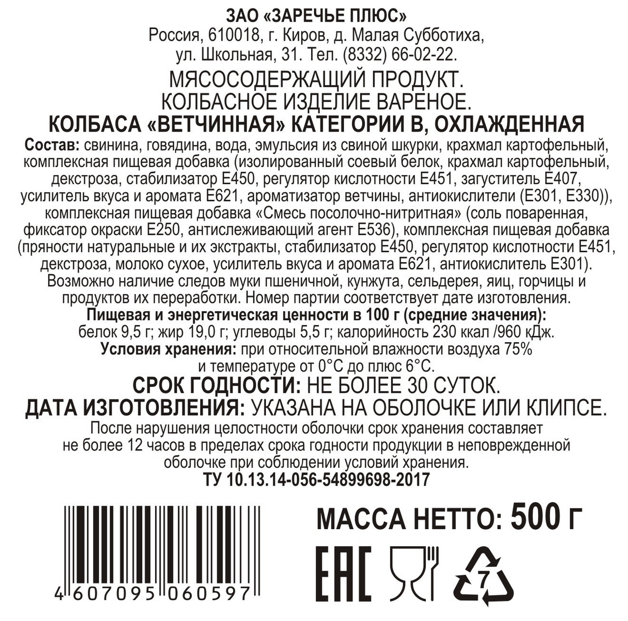Свинина, говядина, вода, эмульсия из свиной шкурки, крахмал картофельный, комплексная пищевая добавка (изолированный соевый белок, крахмал картофельный, декстроза, стабилизатор Е450, регулятор кислотности Е451, загуститель Е407, усилитель вкуса и аромата E621, ароматизатор ветчины, антиокислители (Е301, Е330)), комплексная пищевая добавка Смесь посолочно-нитритная (соль поваренная, фиксатор окраски Е250, антислеживающий агент Е536), комплексная пищевая добавка (пряности натуральные и их экстракты, стабилизатор Е450, регулятор кислотности Е451, декстроза, молоко сухое, усилитель вкуса и аромата E621, антиокислитель Е301).