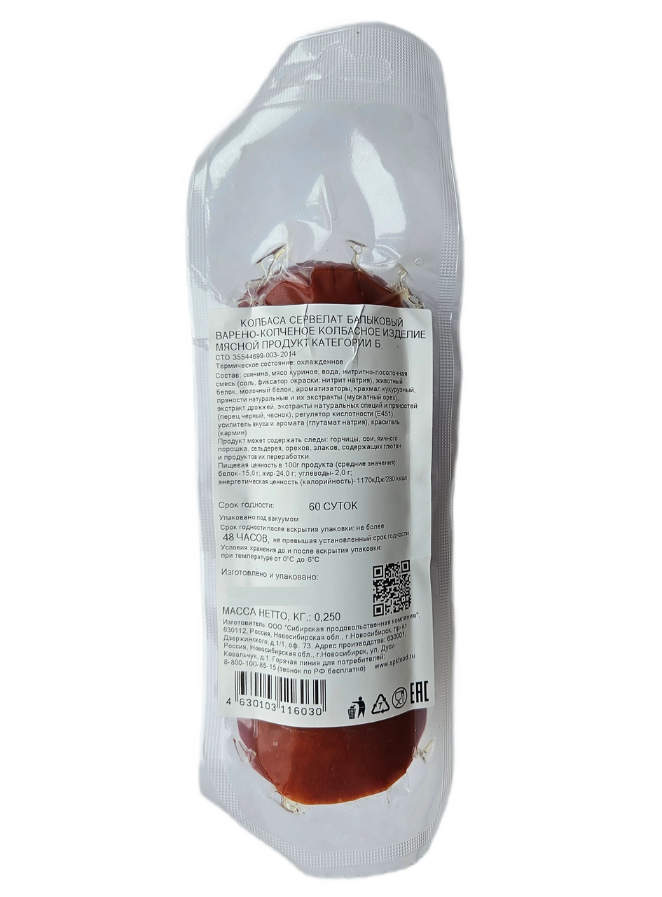 Формат разовой покупки 250г с односторонним срезом для демонстрации богатого структурного мясного среза. Настоящее гастрономическое наслаждение для ценителей качественных мясных деликатесов. Эта ветчинно-рубленая колбаса создана из отборной свинины и нежного куриного мяса, что придает ей сочность и насыщенный вкус. На срезе сервелата видны аппетитные кусочки мяса, создающие привлекательный балыковый рисунок, характерный для продуктов высшего качества. Богатый букет специй, включающий черный перец, чеснок и мускатный орех, придает колбасе пикантные нотки и неповторимый аромат, подчеркивая натуральный вкус мяса. Идеально подходит для создания изысканных закусок, бутербродов или в качестве самостоятельного блюда на вашем столе. Это гармоничное сочетание традиций и высокого качества, способное удовлетворить самые утонченные вкусы гурманов.