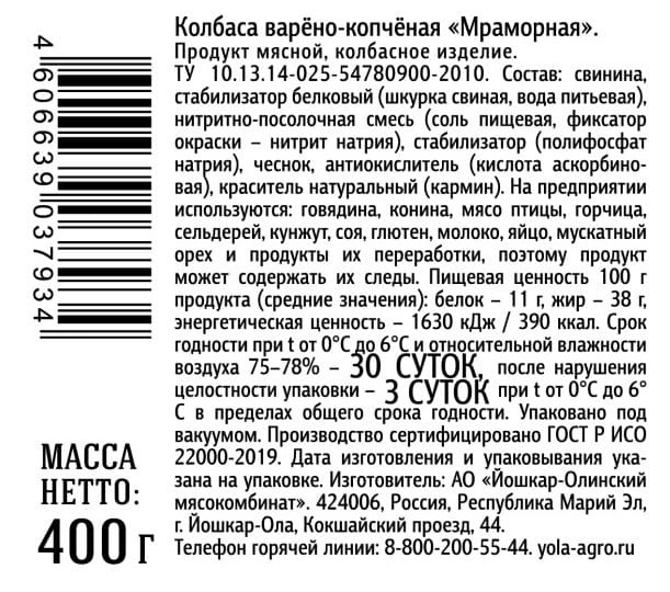 Колбаса Йола Мраморная варено-копченая срез, 400г