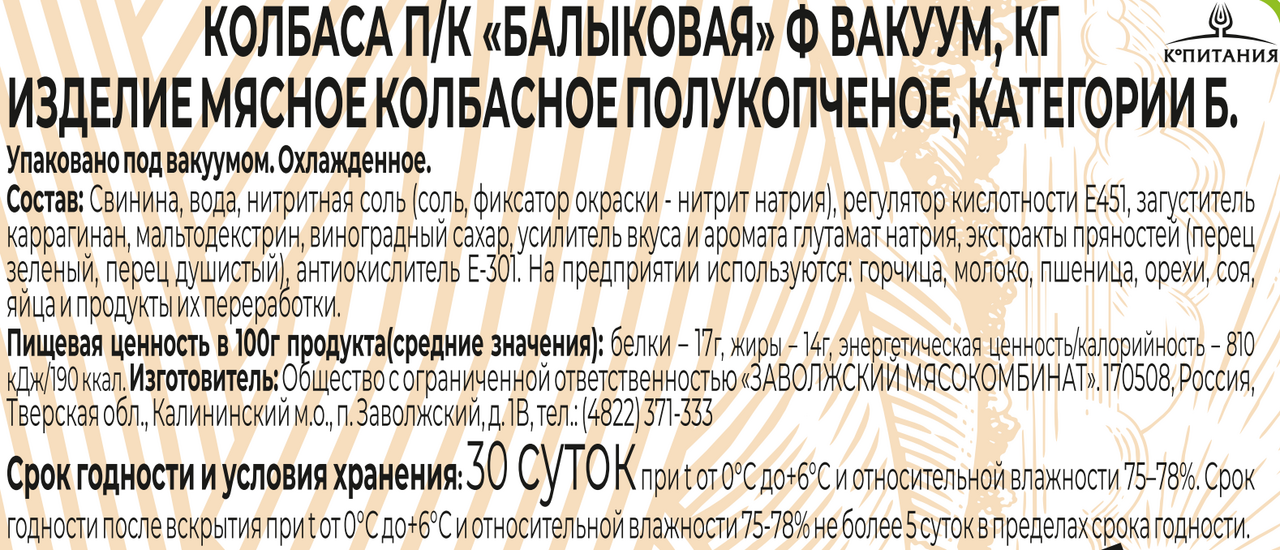 Колбаса Заволжский МК Балыковая полукопченая, ~800г