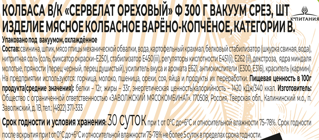 Колбаса Заволжский МК Сервелат ореховый варено-копченая, 300г