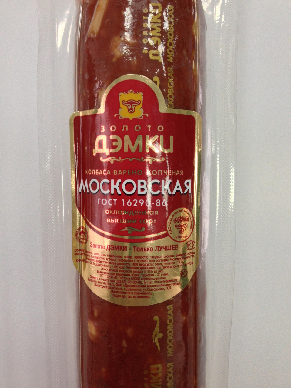 Колбаса Золото Дэмки Московская варено-копченая ГОСТ храниться при относительной влажности воздуха 75-78%, при температурном режиме от 0 до +6 градусов. В нарезанном виде варено-копченая колбаса станет прекрасным украшением стола в составе мясной тарелки. Из нее получаются сытные и вкусные бутерброды, канапе, холодные закуски и салаты. Также его можно добавлять в различные блюда, например, в пиццу или суп. За счет пряного вкуса и дымного аромата колбаса отлично стимулирует аппетит. Продукция на основе мясного фарша изготавливается с использованием тщательно подобранной комбинации специй и пряностей, благодаря чему изделие обладает богатым вкусом с пикантными нотками. Витамины и минералы, которые содержатся в мясном фарше, оказывают положительное влияние на состояние организма.