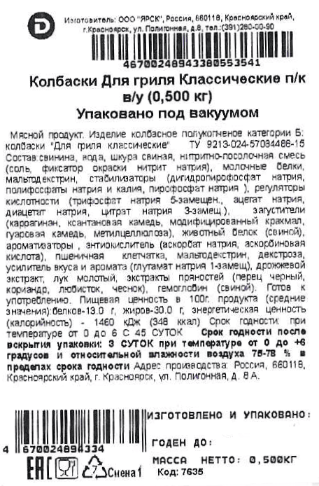 Свинина, вода, шкура свиная, нитритно-посолочная смесь (соль, фиксатор окраски нитрит натрия), молочные белки, мальтодекстрин, стабилизаторы (дигидропирофосфат натрия, полифосфаты натрия и калия, пирофосфат натрия), регуляторы кислотности (трифосфат натрия 5-замещен, ацетат натрия, диацетат натрия, цитрат натрия 3-замещ), загустители (каррагинан, ксантановая камедь, модифицированный крахмал, гуаровая камедь, метилцеллюлоза), животный белок (свиной), ароматизаторы, антиокислитель (аскорбат натрия, аскорбиновая кислота), пшеничная клетчатка, мальтодекстрин, декстроза, усилитель вкуса и аромата (глутамат натрия 1-замещ), дрожжевой экстракт, лук молотый, экстракты пряностей (перец черный, кориандр, любисток, чеснок), гемоглобин (свиной).