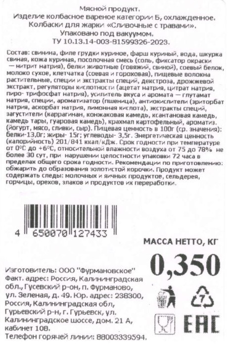 Колбаски для жарки Dolgovgroup сливочные с травами вареные охлажденные, 350г