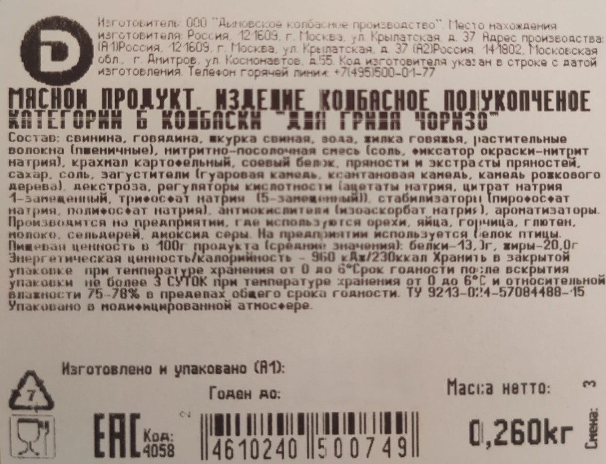 Колбаски Дымов Чоризо для гриля полукопченые, 260г
