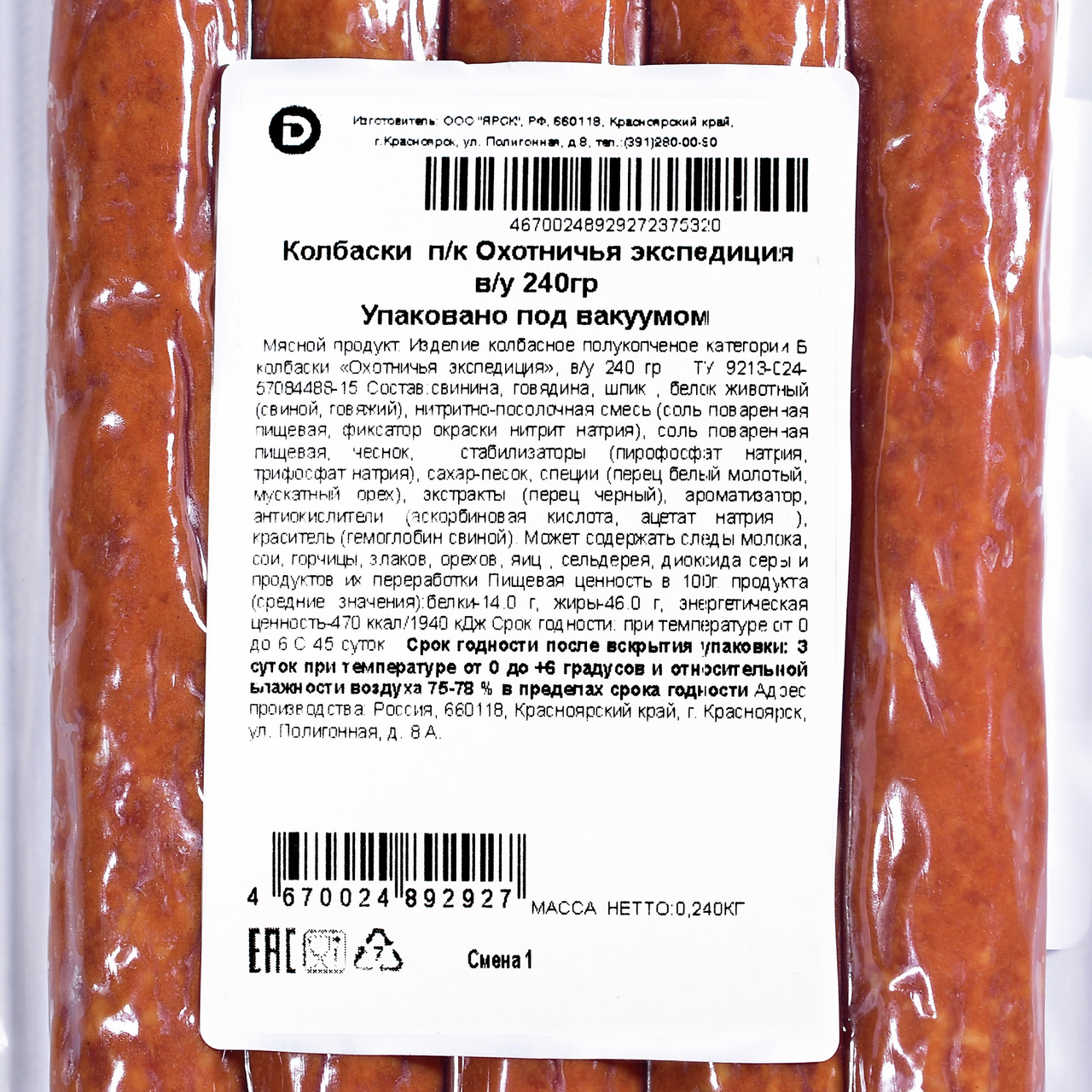 Колбаски Дымов Охотничья экспедиция полукопченые, 240 г – полукопченое изделие в оболочке, которое станет отличным дополнением как к будничному, так и праздничному столу. Продукт имеет классический вкус. Эти колбаски обладают довольно плотной и упругой консистенцией, а также пряно-соленым вкусом с ароматом копчения. Для их производства используется натуральное мясо с добавлением разнообразных специй. Полукопченые колбаски отлично подходят для приготовления сытных сэндвичей и бутербродов. Также их можно добавлять в выпечку и салаты. Они хорошо сочетаются с овощами, зеленью и сыром. Готовить такой продукт можно как на обычной плите так и на открытом огне – все будет зависеть от ваших предпочтений.