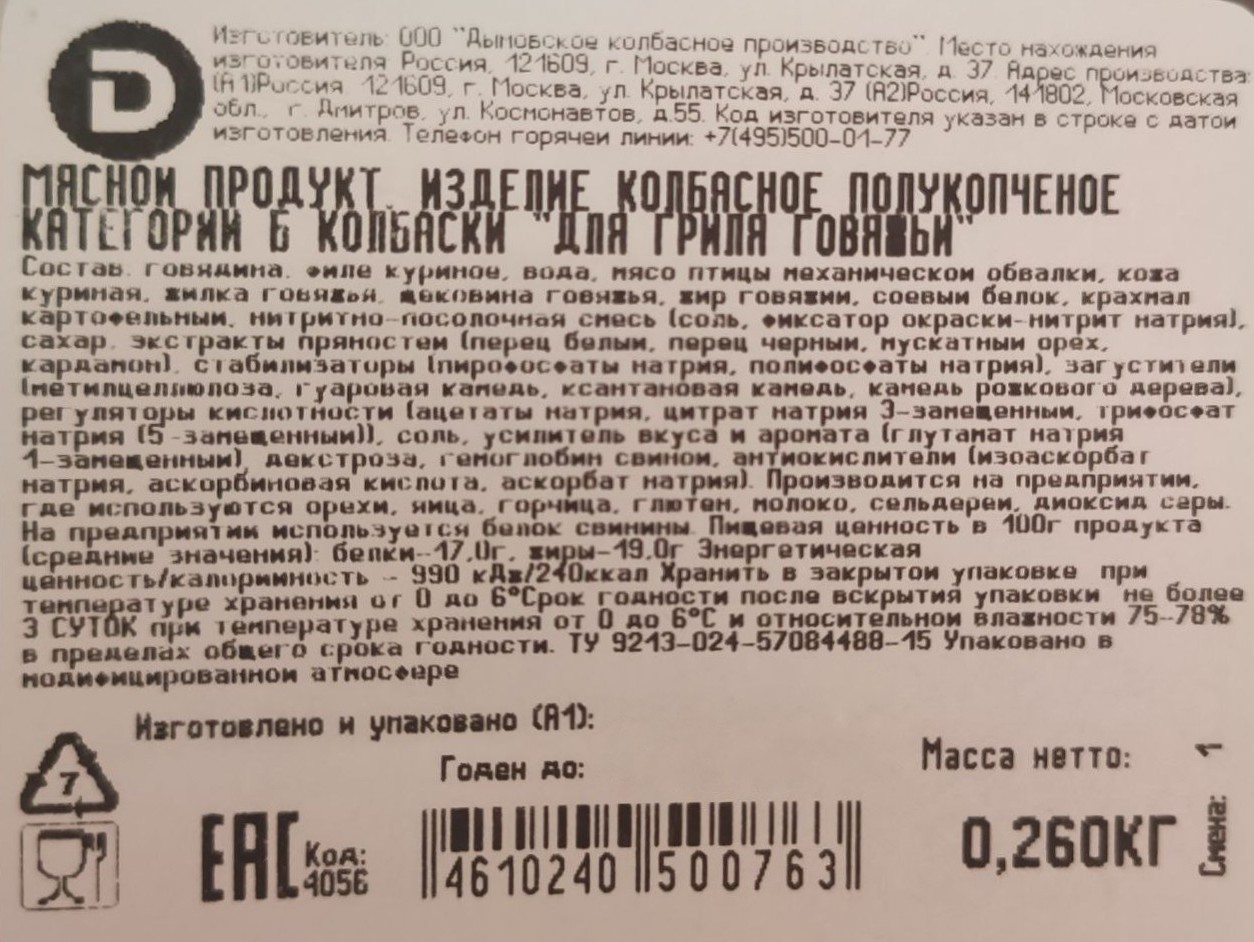 Вернуться назад Колбаски говяжьи Дымов для гриля полукопченые, 260г Оставить отзыв Артикул: 78181 Поделиться В избранное 359 д /шт Цены действуют только для онлайн-заказов Только в торговом центре Товара достаточно В торговом центре Цены действуют только при непосредственном посещении торгового центра МЕТРО 339 д /шт от 1 шт 309 д /шт от 2 шт Бренд ДЫМОВ Страна-производитель Россия Подробнее Описание Классический вкус говядины - проверенный выбор для ценителей настоящего гриля. Идеально для мангала, сковороды и семейного ужина под открытым небом. Полное описание Характеристики Бренд ДЫМОВ Страна-производитель Россия 359 д /шт Цены действуют только для онлайн-заказов Только в торговом центре Товара достаточно В торговом центре Цены действуют только при непосредственном посещении торгового центра МЕТРО 339 д /шт от 1 шт 309 д /шт от 2 шт