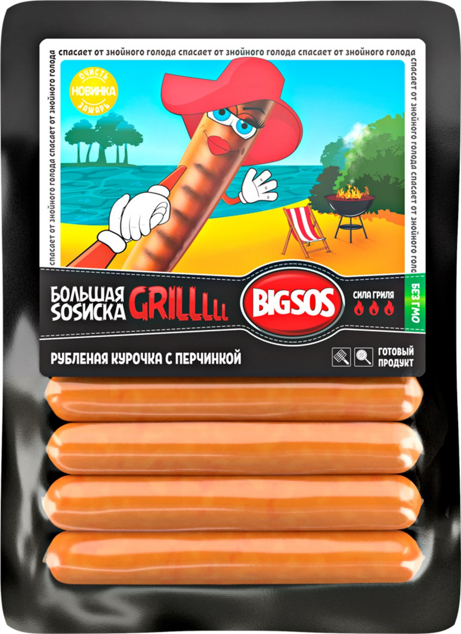Куриные колбаски для жарки Большая SOSиска от СПК отличаются сочностью, интересным структурным срезом и вкусом жареной курочки. Эти рубленые колбаски с перчинкой подходят для приготовления на гриле и на костре и станут отличной альтернативой купатам и шашлыкам. Привлекательная упаковка с эмоциональными героями и превосходное содержимое – лучшее сезонное предложение!