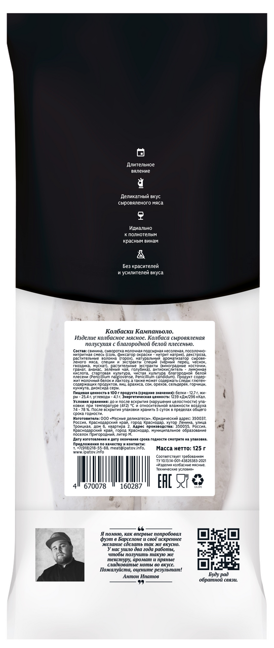 Колбаски Ипатов Компаньоло с белой плесенью сыровяленые, 125г