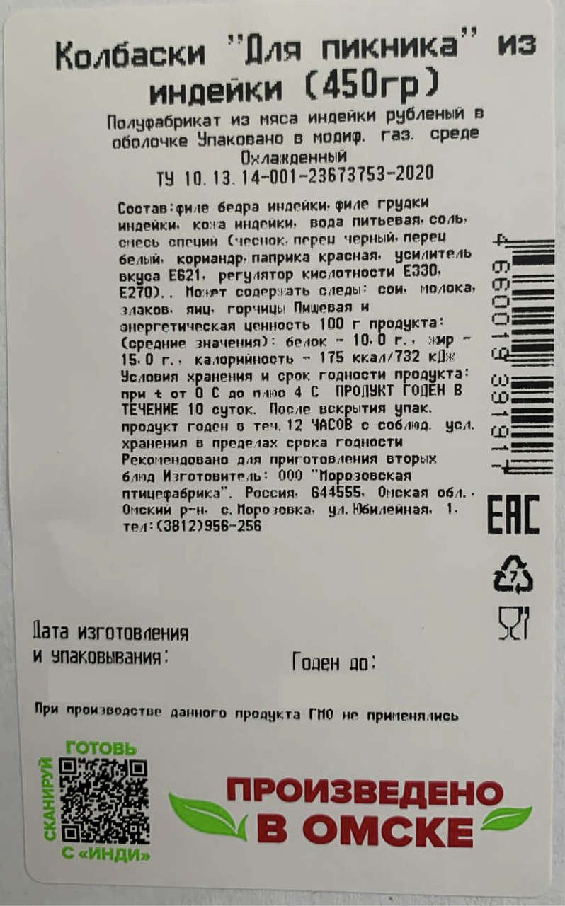 Колбаски из индейки Инди для пикника охлажденные, 450г