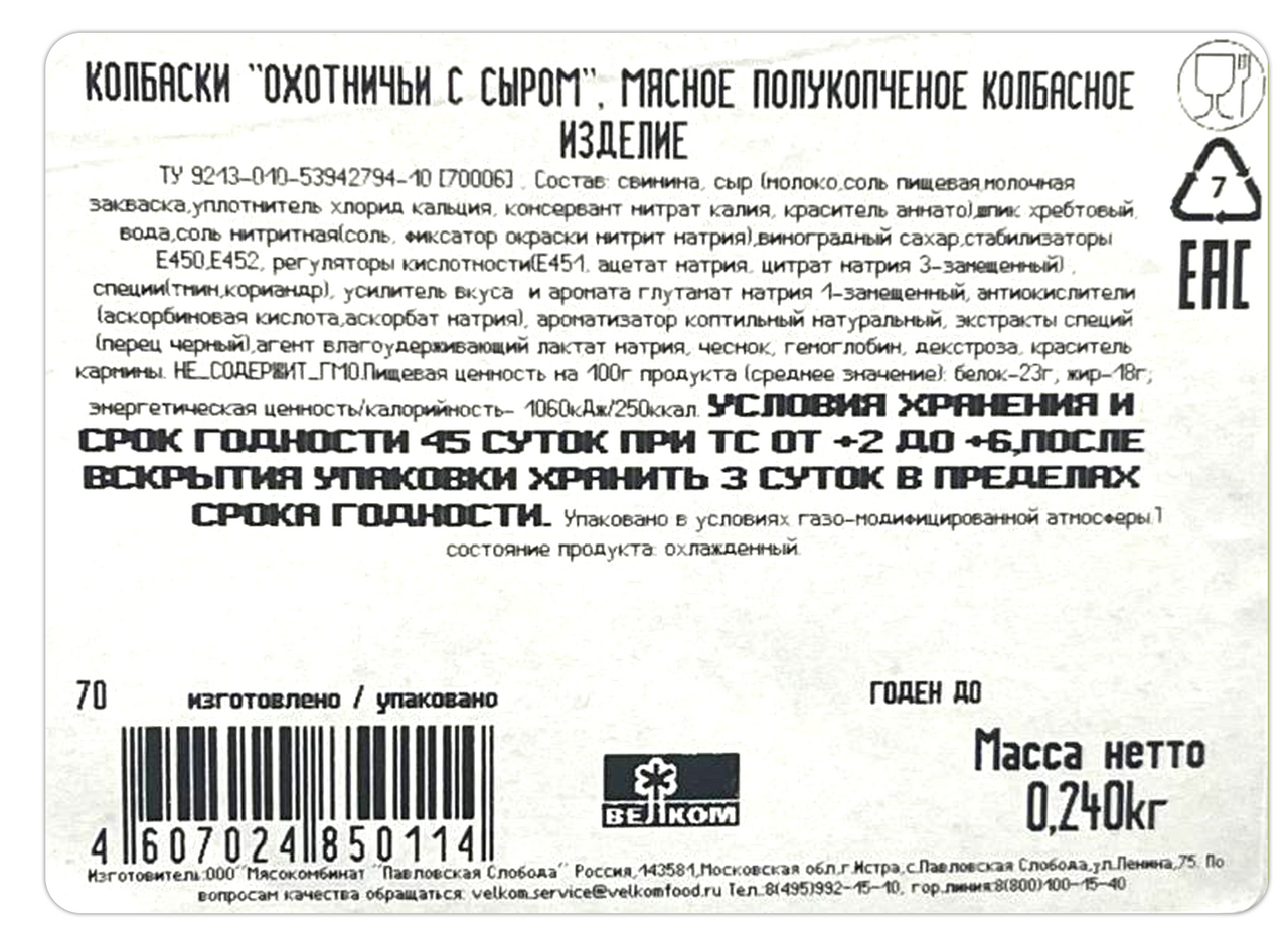 Свинина, сыр (молоко, соль пищевая, молочная закваска, уплотнитель хлорид кальция, консервант нитрат калия, краситель аннато), шпик хребтовый, вода, соль нитритная (соль, фиксатор окраски нитрит натрия), виноградный сахар, стабилизаторы Е450, Е452, регуляторы кислотности (Е451, ацетат натрия, цитрат натрия 3-замещенный) , специи (тмин, кориандр), усилитель вкуса и аромата глутамат натрия 1-замещенный, антиокислители (аскорбиновая кислота, аскорбат натрия), ароматизатор коптильный натуральный, экстракты специй (перец черный), агент влагоудерживающий лактат натрия, чеснок, гемоглобин, декстроза, краситель кармины. продукт может содержать следы: горчицы, злаков, молока, яиц, орехов, сельдерея.