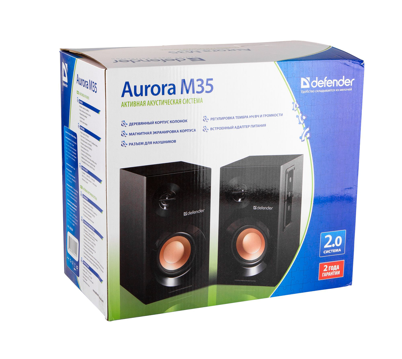 Активная стереосистема Defender Aurora М35 с кристальным звучанием и глубоким басом, идеальный вариант для настольного компьютера. Деревянный корпус колонок. Регулировка тембра НЧ/ВЧ и громкости на левой стенке колонки. Магнитная экранировка корпуса колонок. Размер упаковки: 292 х 178 х 328 мм. Размер сателита: 140 х 250 х 140 мм (1 колонка). Вес: 4,55 кг (2 колонки). Мощность: 2x18 Вт RMS. Диапазон частот: 90-20000 Гц. Сопротивление: 4 Ом. Наличие регулировок: Выключатель питания, громкость, тембр НЧ/ВЧ.Аудиовходы: 2RCA аудио вход.