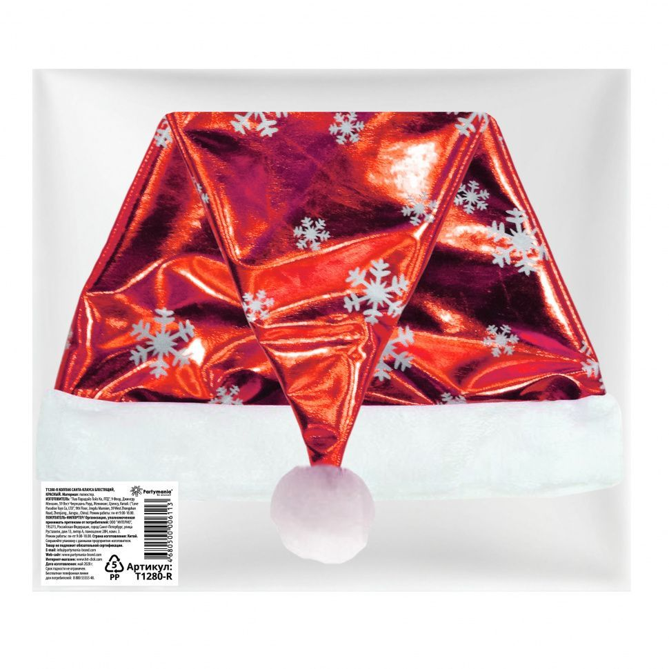 Колпак Санта Клауса Partymania блестящий красный, 40 х 26см