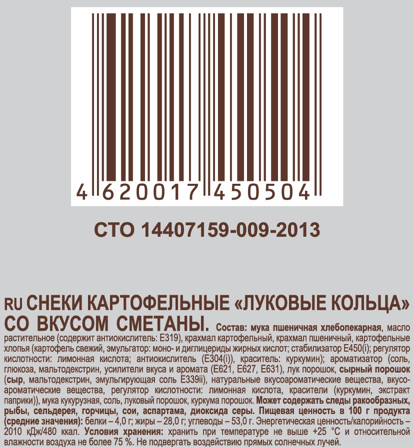 Мука пшеничная в/с, масло растительное (содержит антиокислитель: Е319), крахмал картофельный, крахмал пшеничный, картофельные хлопья (картофель свежий, эмульгатор: моно- и диглицериды жирных кислот; стабилизатор Е450(i); регулятор кислотности: лимонная кислота; антиокислитель (Е304(i)), краситель: куркумин); ароматизатор (соль, глюкоза, мальтодекстрин, усилители вкуса и аромата (Е621, Е627, Е631), лук порошок, сырный порошок (сыр, мальтодекстрин, эмульгирующая соль Е339ii), натуральные вкусоароматические вещества, вкусоароматические вещества, регулятор кислотности: лимонная кислота, красители (куркумин, экстракт паприки)), мука кукурузная, соль, луковый порошок, куркума порошок.