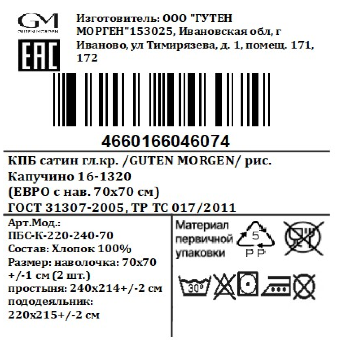 Комплект постельного белья Guten Morgen сатин цвета капучино евро