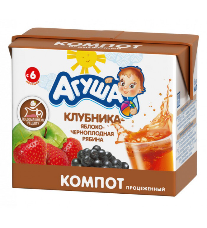 "Детские компоты и морсы Агуша●Без консервантов, без красителей●Нежное сочетание клубники и черноплодной рябины●Готово к употреблению●По домашнему рецепту. Использование уникальной запатентованной технологии приготовления Детское питание под брендом “Агуша” уже много лет производится натерритории Лианозовского молочного комбината. Там вдалеком 1982 году был открыт завод детских молочных продуктов, иуже более 30лет предприятие является официальным поставщиком детского питания намолочные кухни Москвы. Также были открыты новые современные заводы в Поволжье (г.Нижний Новгород), на Юге (г.Тимашевск) и в Сибири (г.Омск)."