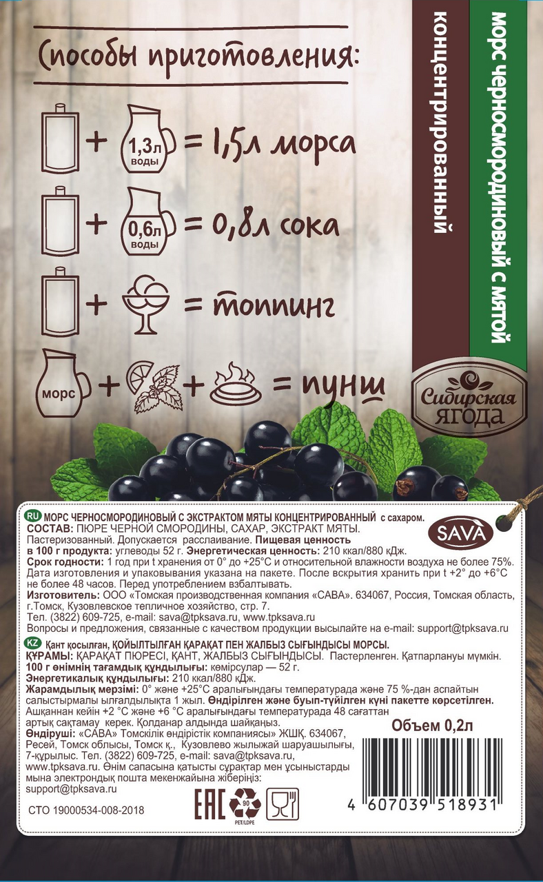Морс Сава Сибирская ягода черносмородиновый концентрированный с мятой, 200мл