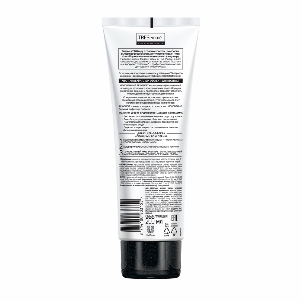 Эстетическая программа для волос у тебя дома? Теперь это возможно с новой коллекцией Тресемме Filler Effect! Мгновенный результат как после профессиональной процедуры тотального восстановления волос. Формула с кератином, серином и пантенолом позволяет заполнить повреждения в структуре каждого волоса. Специальная технология помогает предотвратить дальнейшую потерю кератина, утрачиваемого за счет негативного воздействия внешних факторов. Результат: сияние и гладкость твоих волос мгновенно. Видимый Filler Effect до 2 недель. Для Filler Effect используй всю серию 2 раза в неделю: шаг 1. Бессульфатный шампунь эффективно, но деликатно очищает волосы, даже после использования стайлинг средств. Благодаря отсутствию в составе сульфатов, он не сушит кожу головы и подходит для ежедневного использования. А также подготавливает волосы к последующим шагам ухода. шаг 2. Кондиционер восстанавливает волосы изнутри. Насыщенная формула доставляет питательные компоненты в структуру волоса, способствует укреплению и облегчает расчесывание. Кондиционер подготавливает волосы к нанесению термоактивного завершающего ухода и подходит для регулярного использования в качестве обычного кондиционера. шаг 3. Термоактивный уход запаивает волос в невидимый защитный слой и разглаживает чешуйки волоса. Тресемме – выбор профессиональных стилистов недели моды в Нью-Йорке и миллионов женщин по всему миру. Профессионалы Недели моды в Нью-Йорке знают: каждая укладка зависит от качества волос. Поэтому они выбирают Тресемме – профессиональную основу для создания любого образа. За брендом Тресемме, который появился в салоне красоты, стоит простая истина: каждая женщина должна выглядеть и чувствовать себя великолепно, и все благодаря прическе. Тресемме создает средства для ухода за волосами и стайлинг, которые соответствуют профессиональным стандартам и позволяют создавать образы своими руками. Тресемме. Профессиональная основа для роскошных волос!