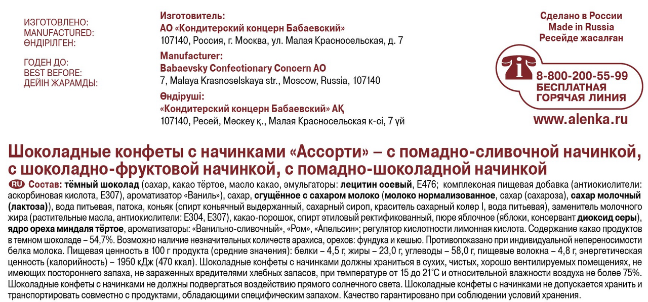 Темный шоколад (сахар, какао тертое, масло какао, эмульгаторы: лецитин соевый, Е476, комплексная пищевая добавка (антиокислители: аскорбиновая кислота, альфа-Токоферол), ароматизатор Ванилин), сахар, сгущенное с сахаром молоко (молоко нормализованное, сахар (сахароза), сахар молочный (лактоза)), вода питьевая, патока, коньяк (спирт коньячный выдержанный, сахарный сироп, краситель сахарный колер I, вода питьевая), жир специального назначения (масла растительные, эмульгатор Е471), какао-порошок, спирт этиловый ректификованный, пюре яблочное (яблоки, консервант-диоксид серы), ядро ореха миндаля тертое, ароматизаторы: Ваниль-сливочный, Ром, Апельсин, регулятор кислотности кислота лимонная.