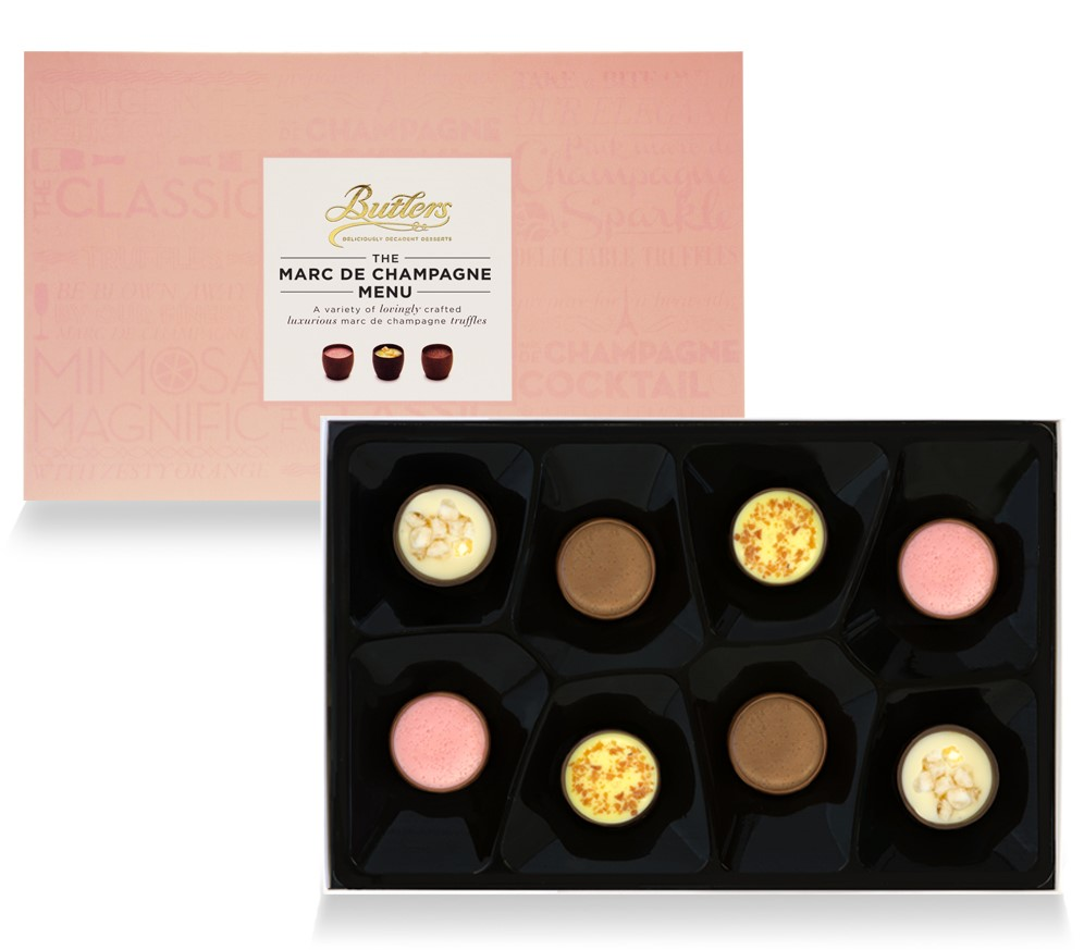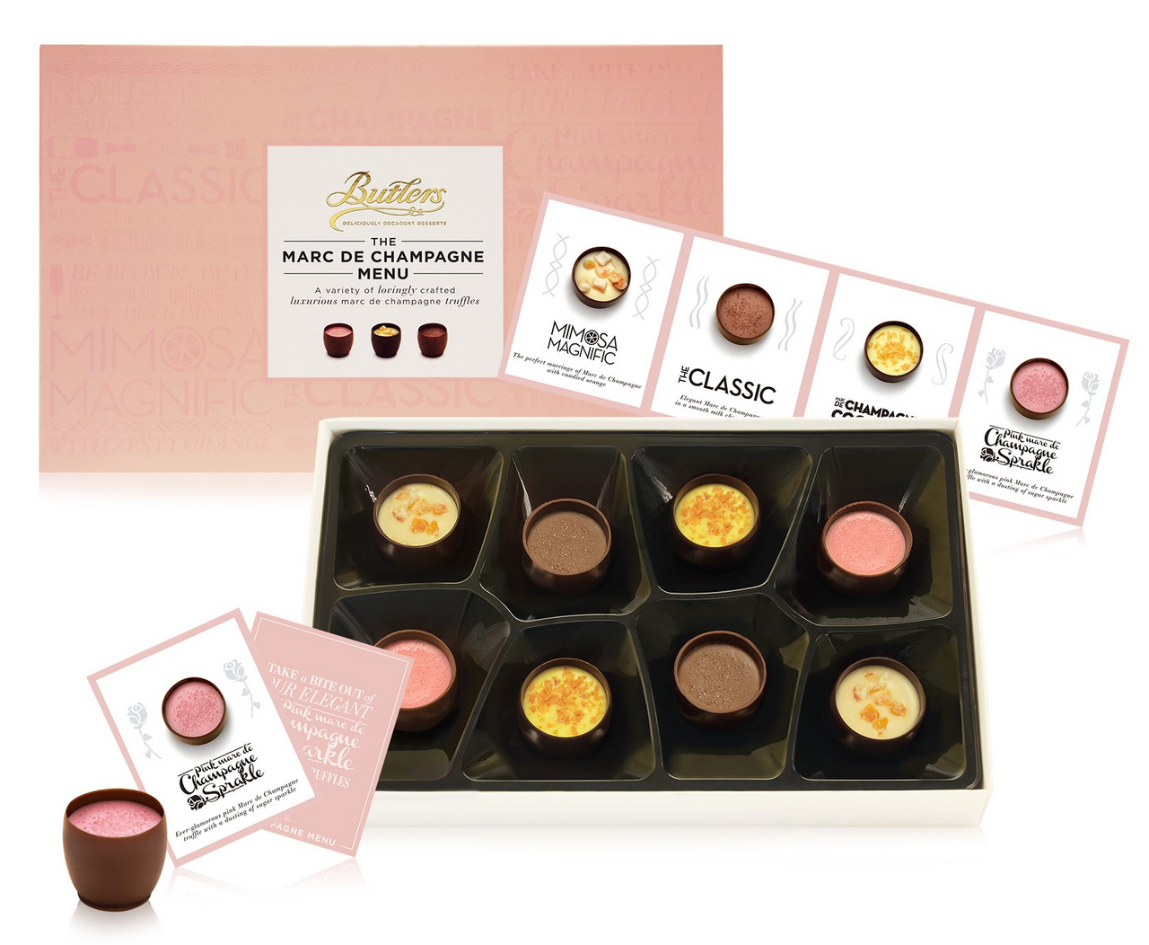 Коллекция изысканных шоколадных конфет с добавлением роскошного Marc de Champagne. Представлено в стильной подарочной коробке нежно-розового цвета.