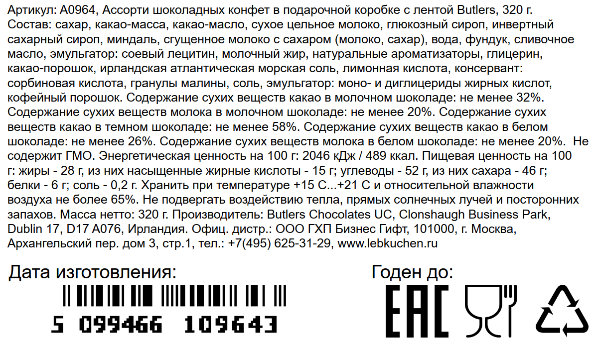 Сахар, какао-масса, какао-масло, сухое цельное молоко, глюкозный сироп, инвертный сахарный сироп, миндаль, сгущённое молоко с сахаром молоко, сахар, вода, фундук, сливочное масло, эмульгатор: соевый лецитин, молочный жир, натуральные ароматизаторы, глицерин, какао-порошок, ирландская атлантическая морская соль, лимонная кислота, консервант: сорбиновая кислота, гранулы малины, соль, эмульгатор: моно - и диглицериды жирных кислот, кофейный порошок.