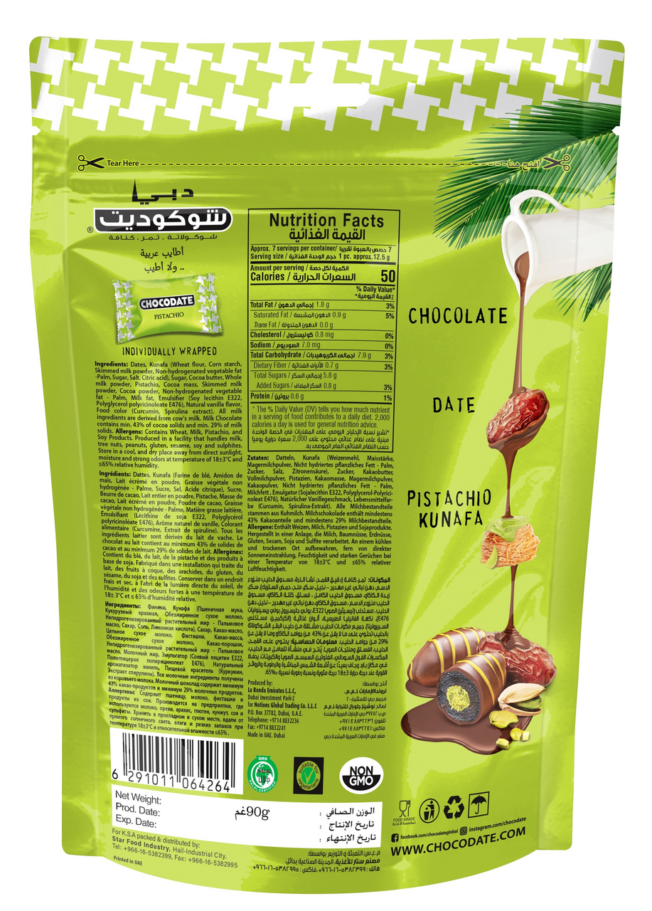 Шоколадные финики с фисташками в стиле Kunafa – роскошь восточных сладостей в одном кусочке! Погрузитесь в мир изысканных вкусов! Шоколадные финики с фисташками в стиле Kunafa - это уникальное сочетание сочного финика, отборных фисташек, нежнейшего шоколада и хрустящих нитей теста кунафа. Идеальный баланс сладости, ореховых нот и текстуры. Вегетарианский продукт, без ГМО. Откройте для себя Chocodate Pistachio Kunafa – восхитительный восточный десерт, покоряющий с первого кусочка! Роскошное сочетание: наслаждайтесь гармонией лучших ближневосточных ингредиентов: сочного финика, премиальных фисташек, бархатистого шоколада и знаменитого хрустящего теста кунафа. Сердце десерта: в основе – нежнейший финик, щедро начинённый отборными фисташками. Шоколадное великолепие: финик с фисташками покрыт слоем нежного шоколада. Хрустящий слой: рассыпчатые нити теста кунафа придают неповторимый восточный колорит и восхитительный хруст. Игра текстур и вкусов: в каждом укусе – идеальный баланс: натуральная сладость финика, насыщенный ореховый вкус фисташек, бархат шоколада и воздушный хруст кунафа. Изысканно и незабываемо! Подходит вегетарианцам | Без ГМО: Наслаждайтесь чистым вкусом качественных ингредиентов.