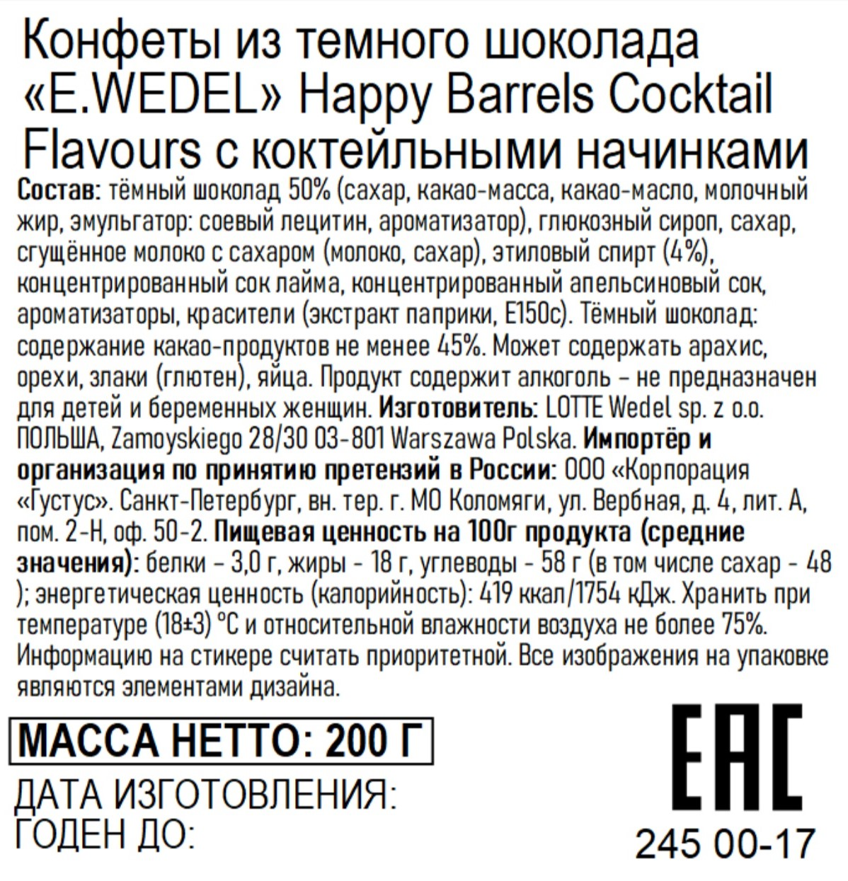 Конфеты E.Wedel Happy Barrels Cocktail Flavours 200г - это мини-бар изысканных вкусов в компактной упаковке. Бочонки из насыщенного тёмного шоколада скрывают жидкие коктейльные начинки с лёгкой алкогольной ноткой - настоящее удовольствие для ценителей оригинальных лакомств.Почему стоит купить? Во-первых, стильный дизайн упаковки в барном стиле сразу привлекает внимание - отличный вариант для подарка или украшения праздничного стола. Во-вторых, сочетание благородного тёмного шоколада с яркими вкусами коктейлей создаёт неповторимые гастрономические ощущения. В-третьих, разнообразие начинок позволяет каждому найти любимый вкус.В ассортименте три коктейльных вкуса:Mojito Drink - свежий микс с нотами лайма и мяты, напоминающий классический мохито;Tequila Sunrise - сочная апельсиновая начинка, которая перенесёт вас в атмосферу летнего бара;Irish Cream - сливочно-карамельный вкус с кофейными оттенками, создающий уютное послевкусие.Побалуйте себя или удивите близких этим необычным лакомством.