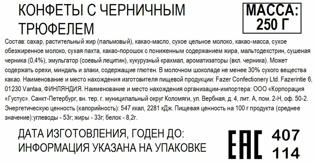 Конфеты Karl Fazer: черничный трюфель в молочном шоколаде, 250г - изысканное лакомство для истинных гурманов. Ищете способ добавить ярких эмоций в повседневность? Откройте для себя шедевр финской кондитерской традиции - конфеты от Karl Fazer с нежной трюфельной начинкой и кусочками настоящей черники. Почему стоит купить? Непревзойденный вкус: сочетание бархатистого молочного шоколада (с содержанием какао 30%) и насыщенной черничной начинки создаёт неповторимый вкусовой букет. Премиальное качество: продукция легендарного бренда Karl Fazer, основанного в 1891 году. Кондитерские изделия производятся по уникальным рецептам с использованием отборных ингредиентов. Щедрая упаковка: 250г - идеально для семейного чаепития или угощения гостей. Эстетичная упаковка: стильный дизайн с узнаваемым синим цветом и золотистой росписью делает конфеты отличным подарком. Универсальность: прекрасно сочетаются с чаем, кофе, капучино или портвейном. Аутентичность: рецепт молочного шоколада впервые появился в 1922 году - это классика, проверенная временем. Конфеты с черничным трюфелем идеально подходят как для торжественных случаев, так и в качестве подарка.