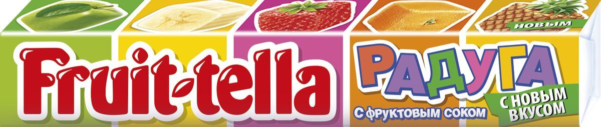 Упаковка с жевательными конфетами Fruittella Радуга поможет создать радостное настроение, быстро утолить голод, послужит наградой за выполненное задание или небольшим презентом — разве мало поводов порадовать себя и близких сладким фруктовым вкусом банана, яблока, апельсина, клубники или ананаса? Маленькие квадратики так и просятся в рот! Для их производства бренд использует соки и натуральные красители, придающие им еще более аппетитный, естественно привлекательный вид.