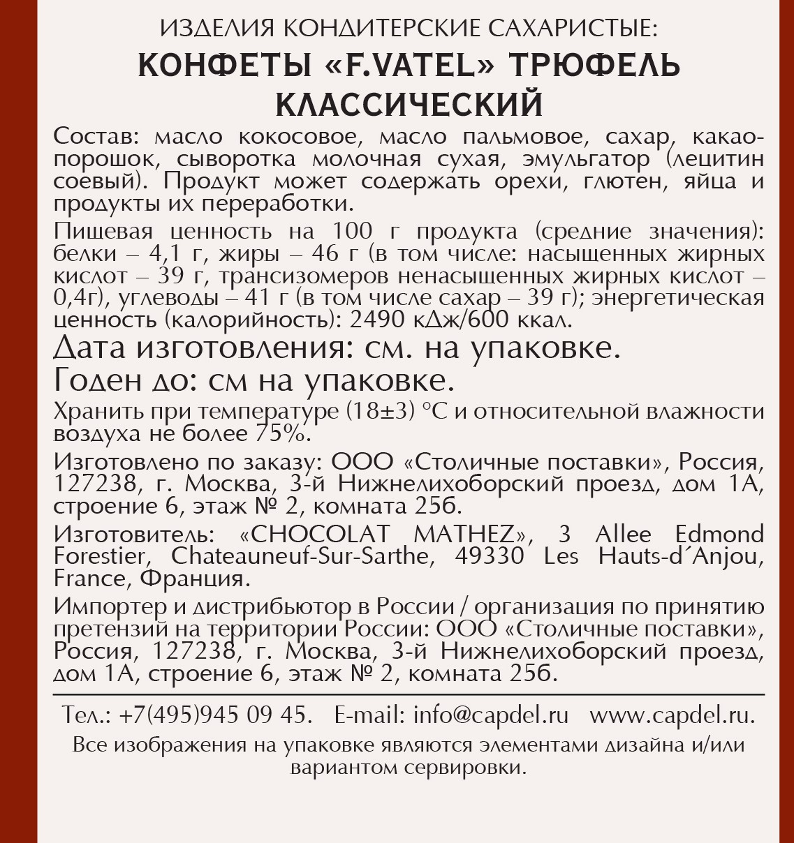 Классические французские трюфели, изготовленные по традиционному рецепту и обсыпанные тонким слоем какао. Французский трюфель - известный во всем мире сладкий деликатес, основа традиций и экспериментов со вкусовыми сочетаниями.