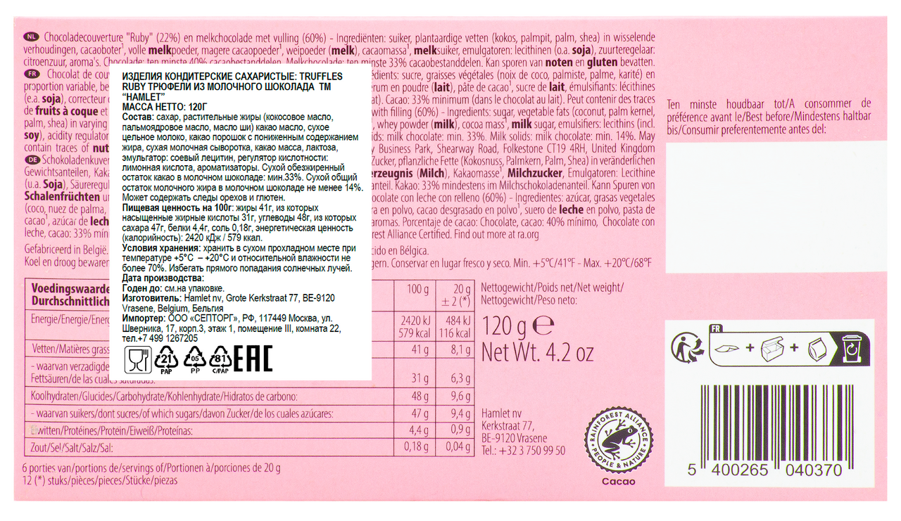 Конфеты Hamlet Ruby трюфели из молочного шоколада, 120г