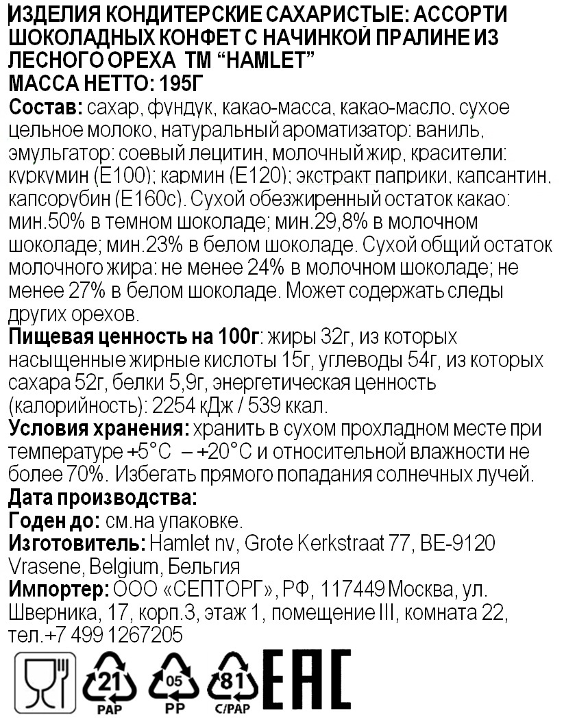 Конфеты Hamlet шоколадные пралине звери и Пасха с окном, 195г